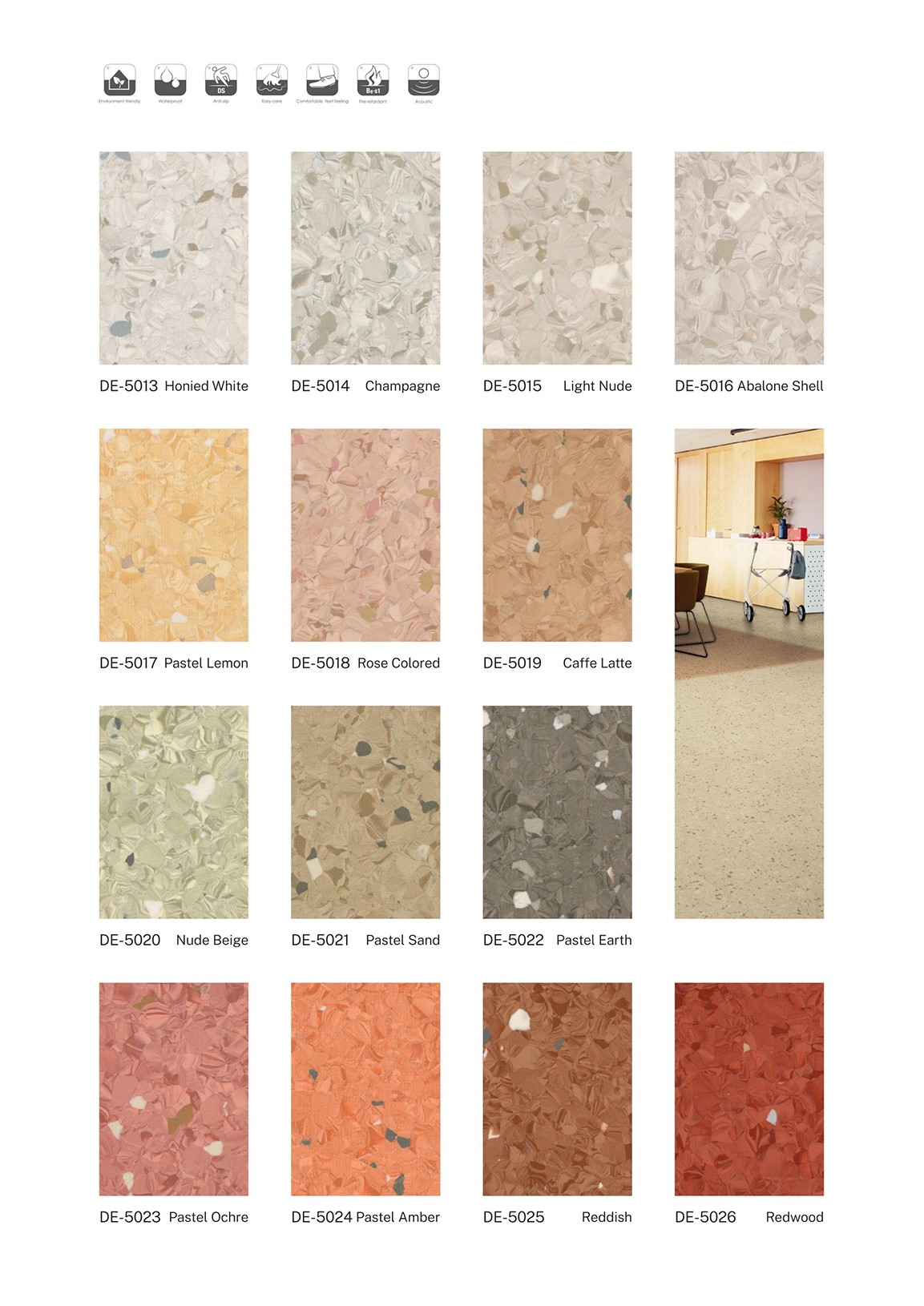 优势:通体结构 超强耐磨 耐压耐冲击 防滑防水 抗菌防霉 易清洁 绿色环保